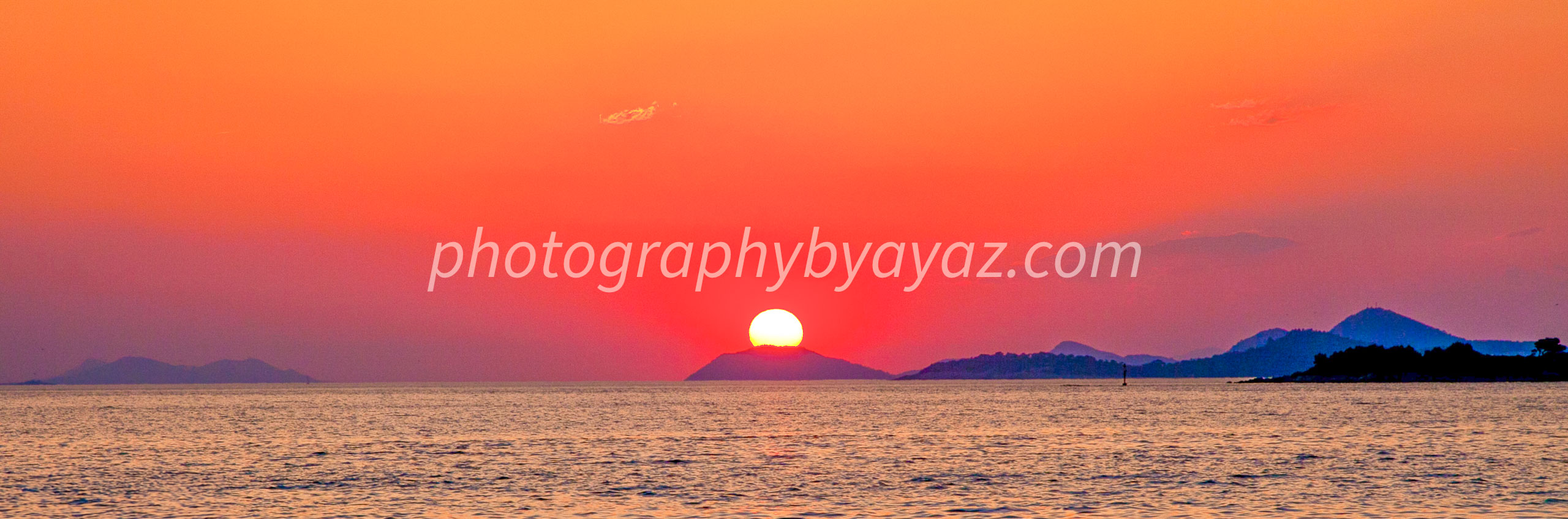 captures the breathtaking moment when day surrenders to night. The sun, partially veiled by a distant mountainous island, casts fiery hues of red, orange, and pink across the sky and water. The reflection dances on the surface, creating a mirror of light and emotion. Islands on the horizon add depth and mystery, drawing the viewer into a scene that feels both expansive and intimate.