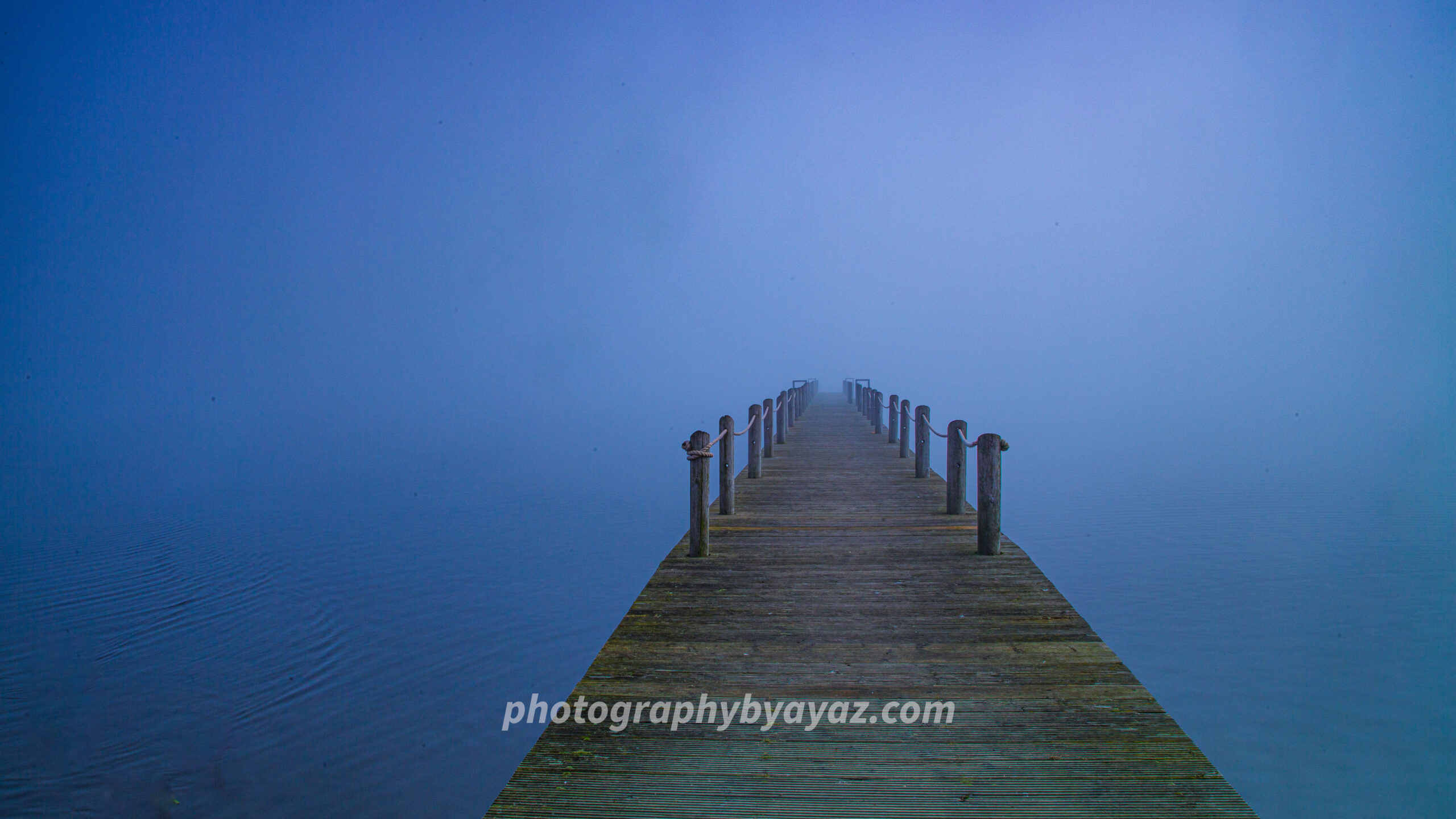 draws you into a world of quiet reflection. A wooden pier stretches into a fog-shrouded body of water, its edges softened by the mist and its destination hidden from view. The ropes and posts lining the walkway add rhythm and structure, while the subtle ripples and blue-toned light evoke a sense of solitude and peace. This photograph is contemplative, atmospheric, and deeply calming—perfect for those who appreciate minimalist beauty and emotional depth.